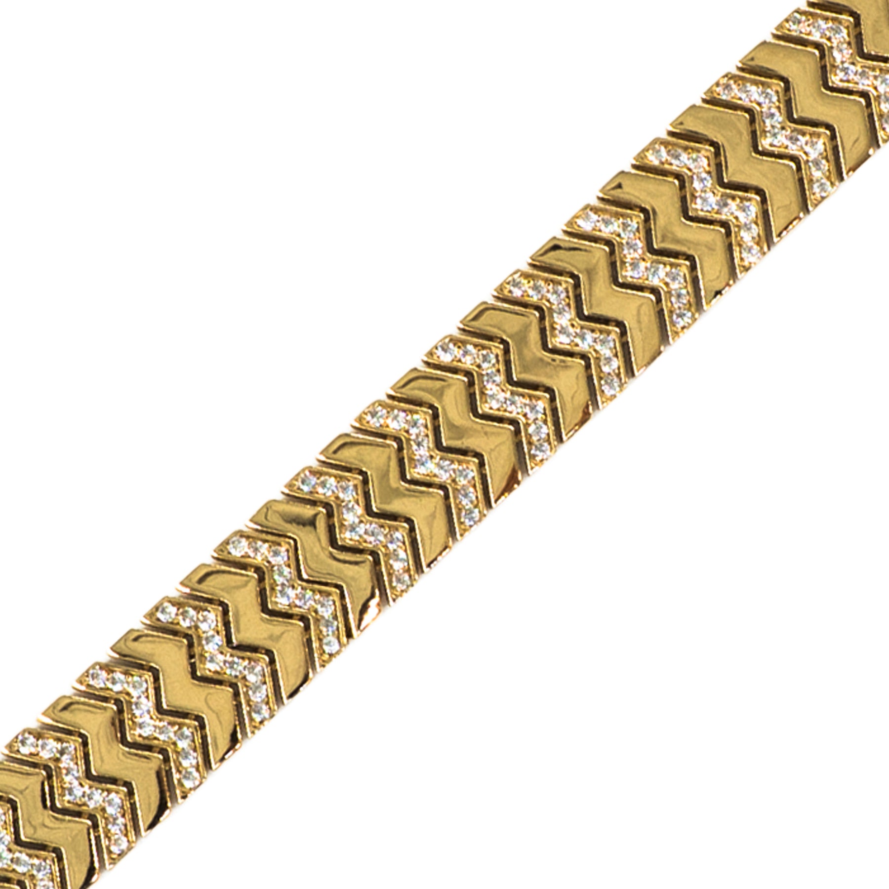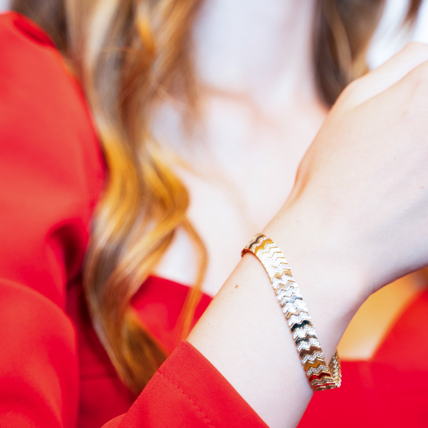 Şıklık ve zarafeti bir araya getiren bu 14 ayar altın zikzak desenli bileklik, taşlı detaylarıyla stilinize göz kamaştırıcı bir ışıltı katar. Hem günlük yaşamda hem de özel davetlerde kombinlerinizi tamamlayacak, zamansız bir parça olarak mücevher koleksiyonunuzda yerini alır.