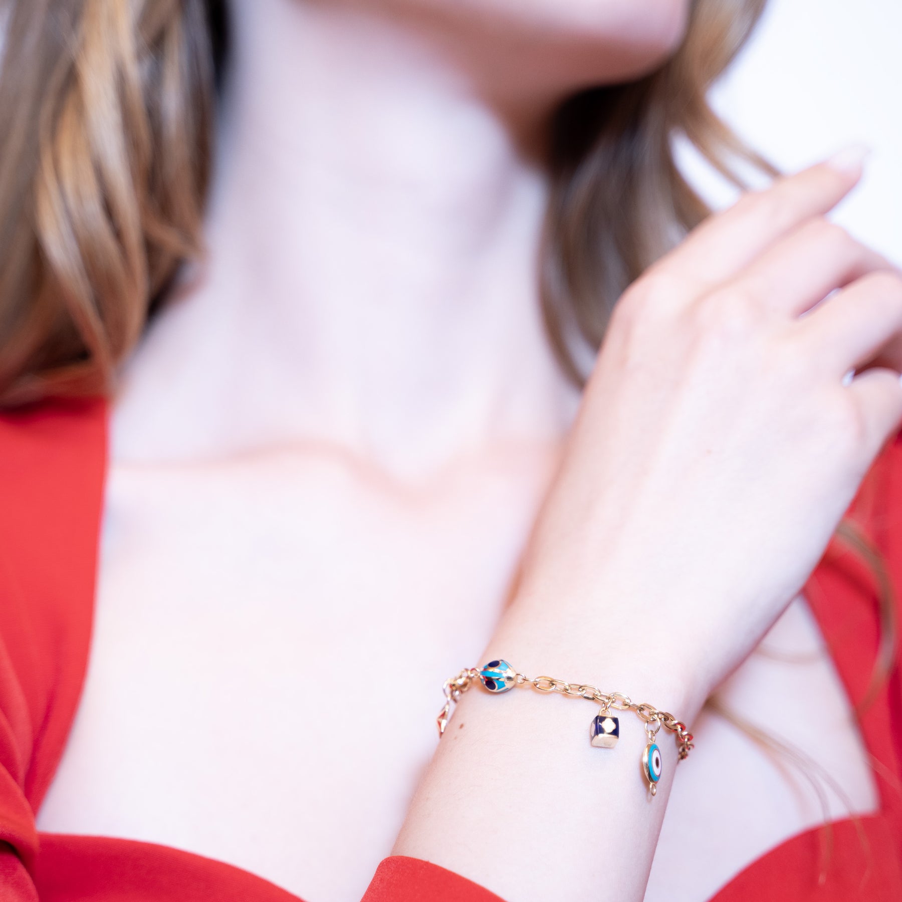 14 Ayar Altın Nazar Boncuklu Renkli Figürlü Bileklik, enerjik tasarımı ve estetik detaylarıyla dikkat çeker. Hem zarif hem de modern duruşuyla günlük kombinlerinize hareket katarken, özel günlerde de şık bir aksesuar olarak stilinizi tamamlar.