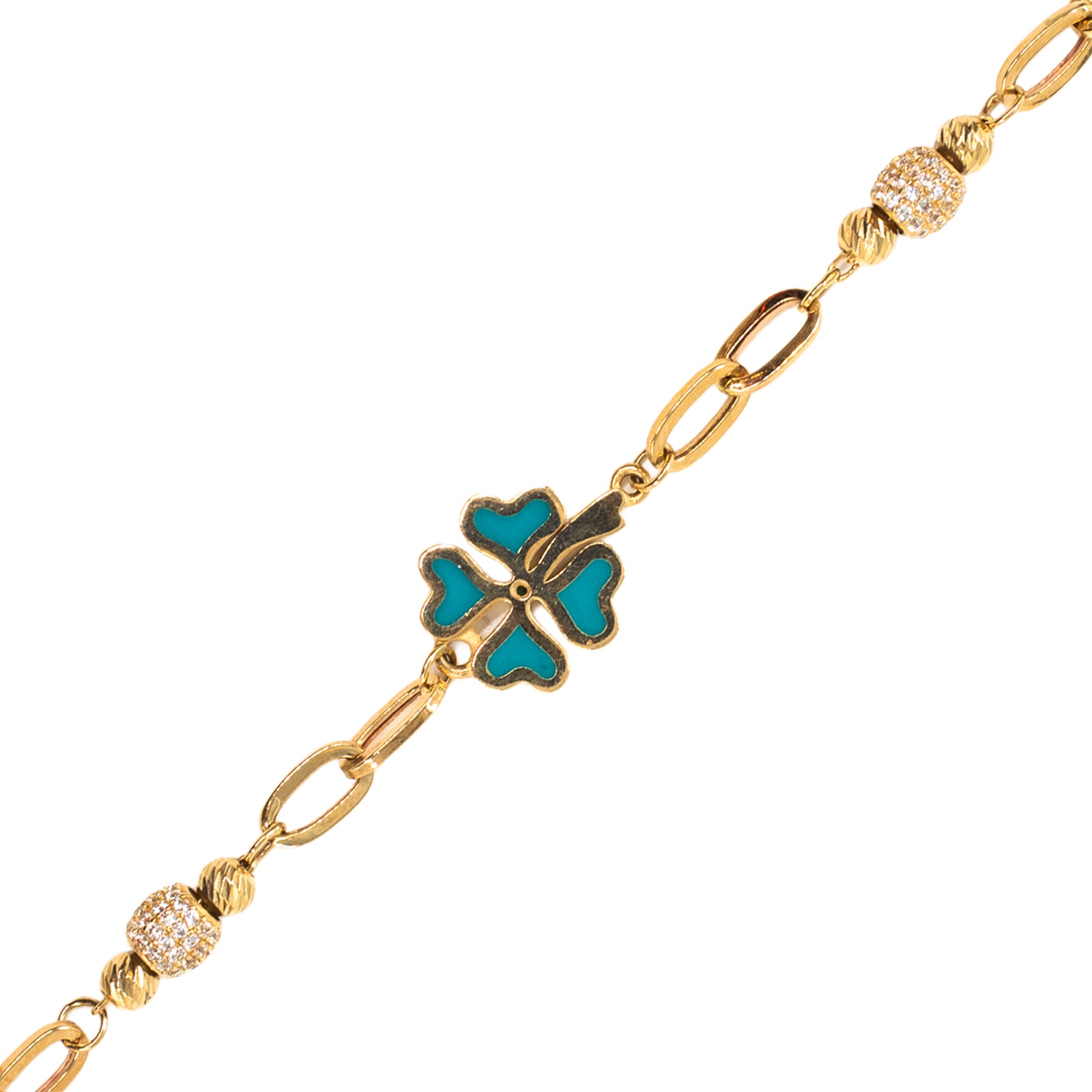14 Ayar Altın Yonca Figürlü Bileklik, şıklığı ve anlamı bir arada sunan özel bir tasarımdır. Zarif detayları ve modern görünümüyle günlük kombinlerinizi tamamlar, sevdiklerinize değerli ve anlamlı bir armağan olarak öne çıkar.
