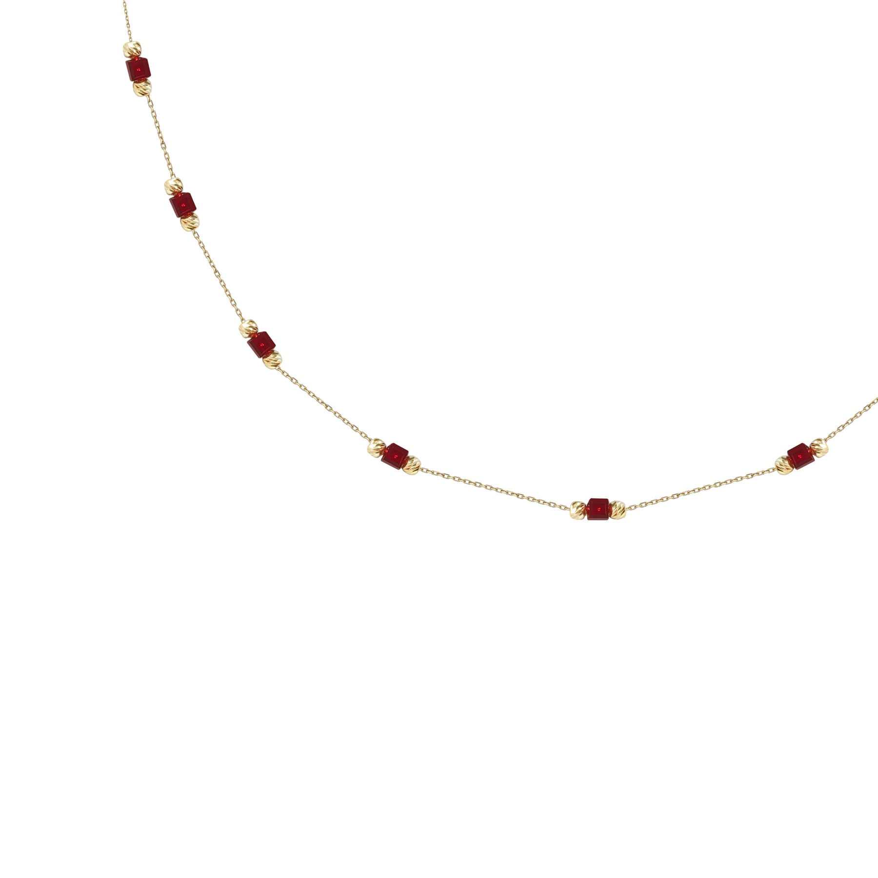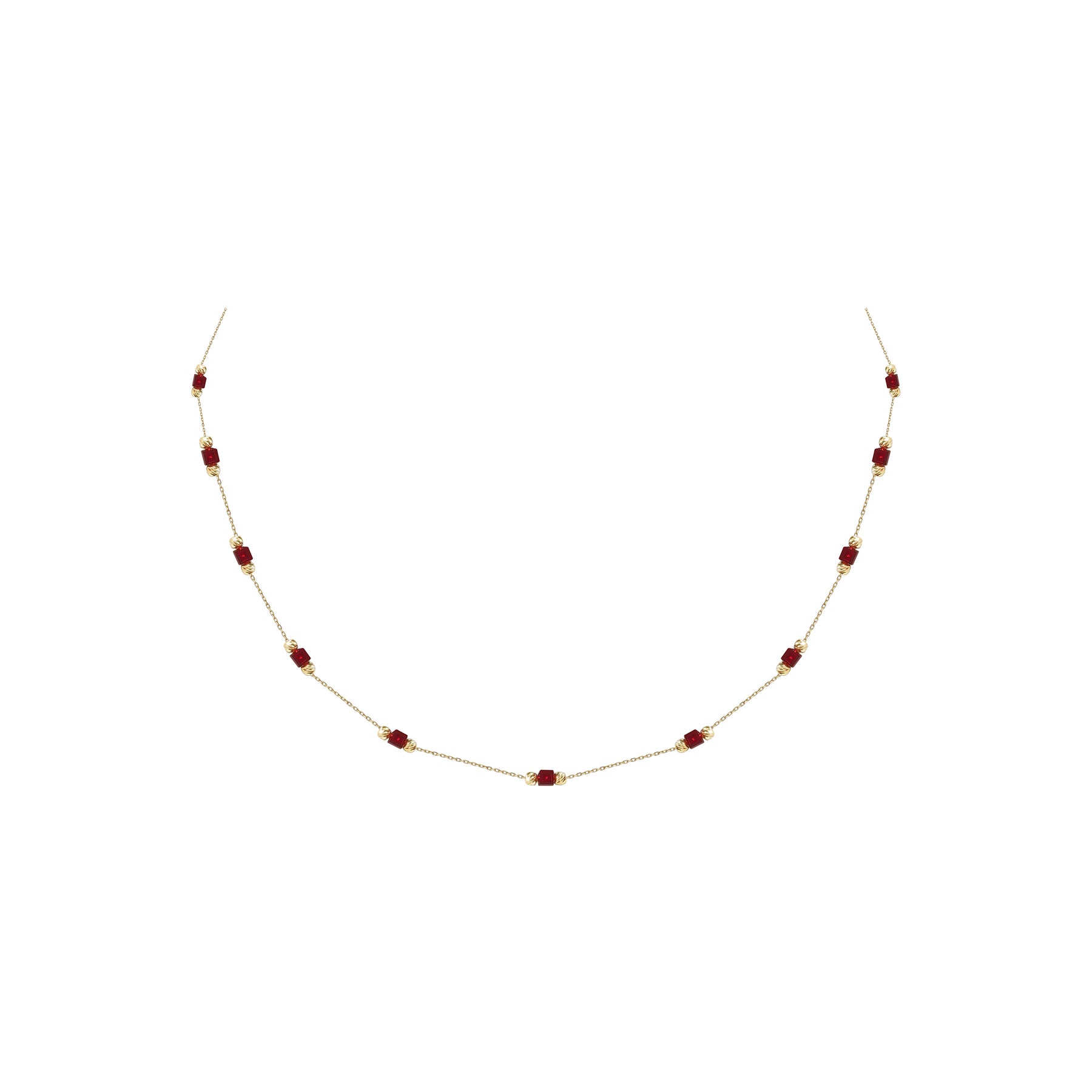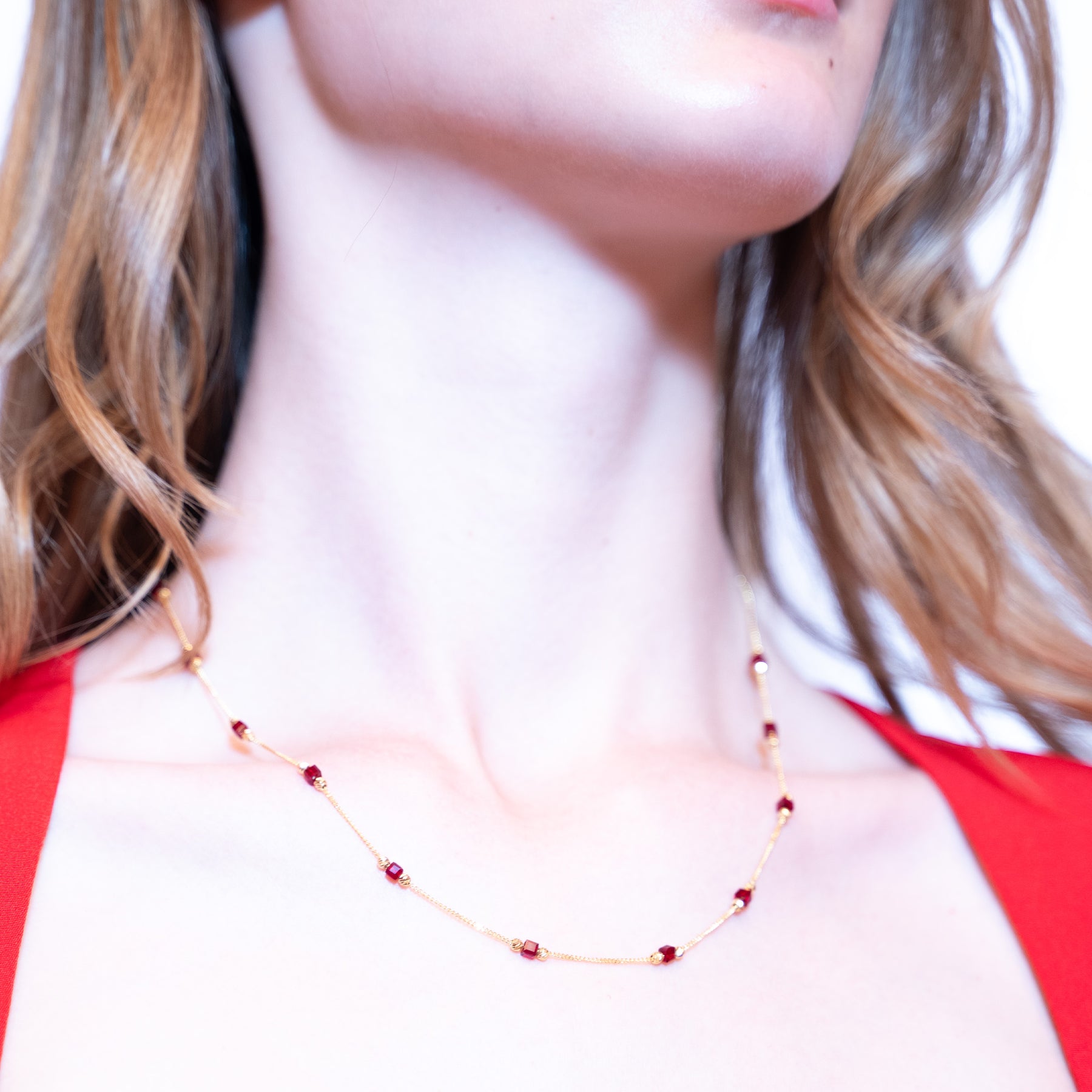 Kırmızı taşların göz alıcı rengiyle öne çıkan bu kolye, stilinize canlılık katarak hem günlük kullanım hem de özel günler için ideal bir seçenek sunar.