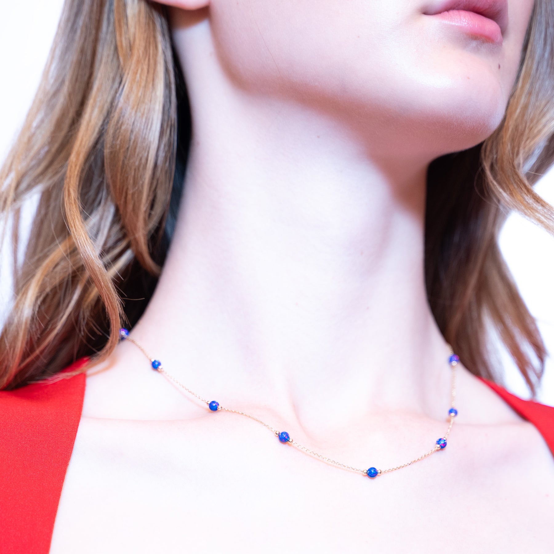 Mavi taşların enerjisiyle öne çıkan bu kolye, zarif duruşuyla stilinize özgün bir dokunuş katar. Hem kendiniz hem de sevdikleriniz için şık ve anlamlı bir hediye seçeneğidir.